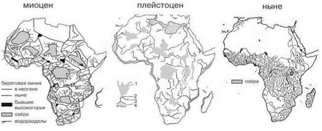 Современное распространение таксонов в пределах Африки преимущественно определяли изменения гидрологической сети континента (Рис. 4.15). В общих чертах оно состояло из двух процессов: увеличения и уменьшения площади пресноводных бассейнов и количества воды в них вслед за изменениями климата и постепенному укрупнению водосборных бассейнов и перераспределению стока в бассейн Атлантического океана. Наиболее заметными событиями последней группы были удлинение рек Нила, Конго и Оранжевой.