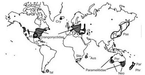 Этот первичнопресноводный таксон возник, по-видимому, до распада Пангеи. Crangonyctidae и Paramelitidae широко распрострaнены первый на континентах Лавразии, второй — Гондваны, остальные семейства имеют реликтовые ареалы, преимущественно в умеренных районах обоих полушарий: All — Allocrangonyctidae, Aus — Austrocrangonyctidae, Cry — Crymostygiidae, fal — "faiklandiellids”, Neo — Neoniphargidae, Par — Paracrangonyctidae, Per — Perthiidae, Phr — Phreatogammaridae, Pse — Pseudocrangonyctidae, Ste — Sternophysingidae. По: Vainola et al., 2008). Ранее к этому надсемейству относили и индостанский Indoniphargus.