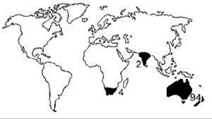 Рис. 4.26. Ареал изопод Phreatoicidea. Цифры — число видов.