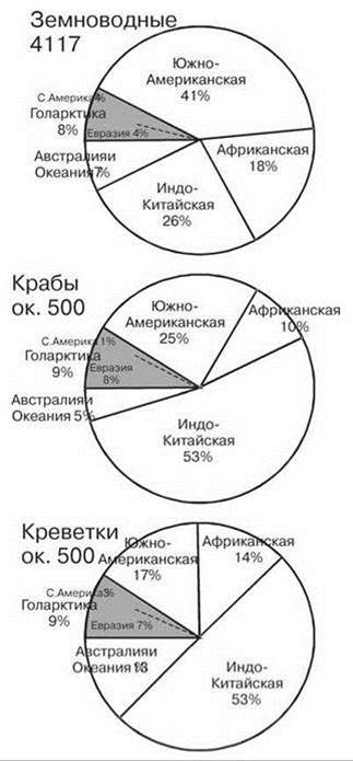 Рис. 4.35. Число видов амфибий и крабов в разных биогеографических регионах.