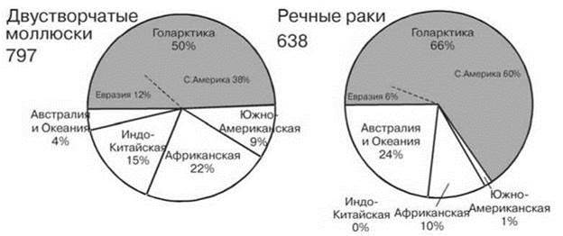 Возможно, не последнюю роль тут сыграло существенное обеднение биот континентальных водоёмов Голарктики в результате оледенений. На это указывает сравнение числа видов наяд и речных раков североамериканской и евразийской частей Голарктики: в евразийской части обитает 92 вида наяд и 38 видов речных раков, тогда как в североамериканской — 302 и 382 соответственно (Crandall, Buhay, 2007; Bogan, 2007), причём это разнообразие обеспечивается почти исключительно бассейном Миссисипи, не подвергавшемся оледенению. Сходную картину дают и другие группы, например пресноводные рыбы (Рис. 4.43), лишь крабы разнообразнее в Палеарктике, нежели в Голарктике, что, вероятно, связано с их крайне высоким разнообразием в тропической Азии (Рис. 4.36).