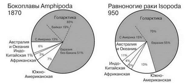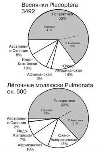 Сходно распределены Gastropoda. Логично допустить, что дышащие воздухом гастроподы более приурочены к нарушенным местообитаниям, нежели дышащие жабрами, т.е. среди первых доля ценофобов, вероятно, существенно выше. Как отмечено выше в оз. Танганьика дышащие воздухом гастроподы (прудовики Lymnaeidae, катушки Planorbidae, ампулярии Ampullariidae = Pilidae) обитают за пределами специфических ЦС озера, а эндемы имеются только среди дышащих жабрами гастропод, которые напротив, обитают почти исключительно в них, причём эдемизм этот весьма высокого ранга: из 4 подсемейств переднежаберных гастропод Thiaridae два эндемичны для Танганьики и оба они не встречаются в ассоциированных водоёмах. В Байкале ситуация несколько отлична. И хотя и тут 2/3 эндемов не принадлежат к лёгочным моллюскам, из эндемичных лёгочных моллюсков 40% приндлежит к Acroloxidae (чашечкам) — почти исключительно палеарктическому семейству, представители которого живут или в крупных озёрах, или в реках на быстром течении. Зато эндемичных прудовиков в Байкале нет. В целом 2/3 фауны лёгочных моллюском приурочено к Голарктике (Рис. 4.39).