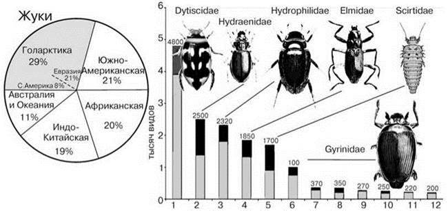 Рис. 4.38. Число видо жуков в разных биогеографических регионах и ожидаемое число видов семейств водных жуков в мировой фауне.