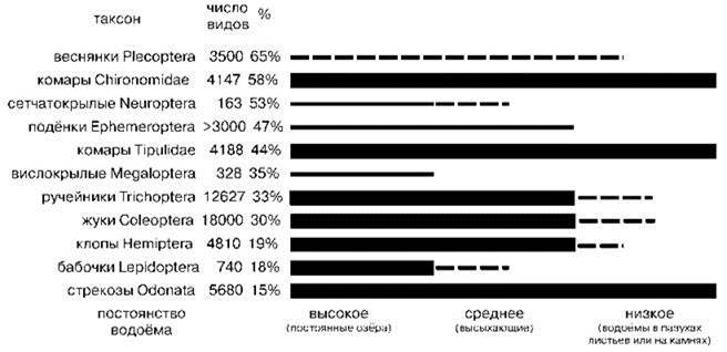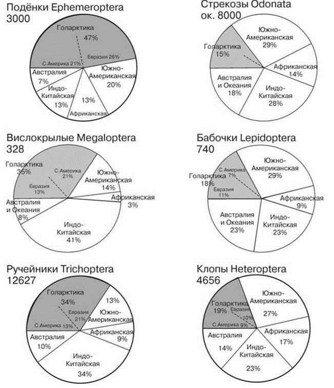 Любопытно также сравнительно равномерное распределение амфибийных виды, и, в частности, насекомых по областям (Рис. 4.38—4.40). Разнообразие одних групп в Голарктике значительно выше, чем в других областях, особенно веснянок. Разнообразные как в постоянных, так и во временных водоёмах жуки, ручейники и подёнки разнообразны и в Голарктике (29—47% мировой фауны). Стрекозы, бабочки и клопы дают практически идентичную картину: они сравнительно бедны в Голарктике (15—18% мировой фауны). Можно даже утверждать, что водные насекомые, в отличие от наземных, разнообразнее в умеренных широтах. Возможно, это связано с тем, что амфибийные виды — большей частью ценофобы, приуроченные к эфемерным водоёмам и водоёмам с высокоизменчивыми условиями. В стабильных условиях ЦС крупных озёр безраздельно доминируют ценофильные виды, роль насекомых там незначительна. В условиях умеренного климата к высокоизменчивым и/или эфемерным водоёмам относится большая часть мелких водоёмов (лужи, родники, ручьи, речушки). В низких широтах из-за менее изменчивого климата биота подобных водоёмов может включать больше ценофильных видов.