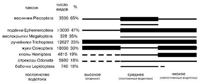 Рис. 4.42. Относительное число видов разных отрядов насекомых, обитающих в водотоках разного типа (в скобках приведены примеры водоёмов).