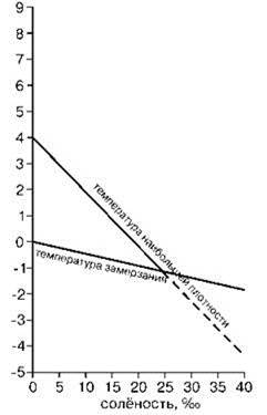 С увеличением солёности температура, при которой вода имеет наибольшую плотность, постепенно приближается к температуре замерзания, и при солёности 24,695%о они одинаковы (-1,33°С). При дальнейшем увеличении солёности температура наибольшей плотности воды становится ниже точки замерзания (Рис. 5.21).