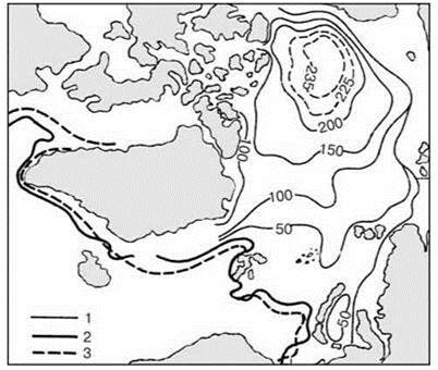 1 — глубина залегания изогалины 34%о в конце зимы (м); 2 — положение изогалины 34%о на поверхности летом; 3 — кромка льда в конце зимы. По В.Ф. Захарову (1978).