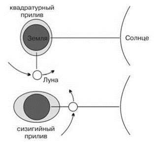 Поскольку приливы вызывает влияние Луны и Солнца, в тот момент, когда Луна и Солнце находятся на одной прямой, высота приливов максимальна (сизигийные приливы). А когда направления на Луну и Солнце максимально различаются, высота приливов минимальна (квадратурные приливы). Из-за неравенства лунных и солнечных суток интервалы между сизигийными (квадратурными) приливами непостоянны, а сизигийные и квадратурные приливы наступают не в момент полнолуния (новолуния), а на один-два дня позже.