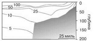 Примерами последних районов могут служить апвеллинги. Органическое вещество здесь создаётся непосредственно в районе апвеллинга. Высокопродуктивные пелагические сообщества апвеллингов плохо сбалансированы, поэтому существенная часть создаваемого в них органического вещества падает на дно. Поднимающаяся вода содержит сравнительно мало кислорода: хотя в момент опускания она была насыщена кислородом, по мере продвижения её к апвеллингам, кислород расходовался, не пополняясь, а вертикальная циркуляция происходит здесь снизу вверх. В результате на дне в районах апвеллингов содержание кислорода очень низко (Рис. 5.33), местами падает до нуля, и наблюдаются заморы. Бентос в районах апвеллингов беден как качественно, так и количественно, местами вовсе отсутствует (Карпинский, 1984, 1987, 1988, 1996, 2000; Кучерук, 1985а). Распределение кислорода в придонных слоях и бентоса непрерывно меняется в соответствии с меняющейся картиной циклонических и антициклонических круговоротов и меандр, образующих апвеллинг.