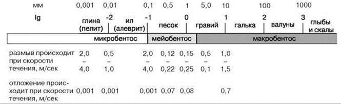 Размер частиц грунта тесно связан со скоростью придонного течения. Для каждого размера частиц имеются свои скорости, при которых происходит отложение и размыв (Шуляк, 1971). Эти скорости существенно различны. При постоянной скорости движущейся воды состав грунта со временем станет соответствующим этим скоростям (Табл. 5.1). Степень такого соответствия называется сортированностью. Хорошо сортированные грунты соответствуют теоретическим ожиданиям, плохо сортированные — нет. В реальности механический состав грунта никогда не соответствует теоретически ожидаемому по скорости придонных течений, поскольку многие факторы препятствуют сортировке грунта, влияя на его гранулометрический состав. Из них основные: