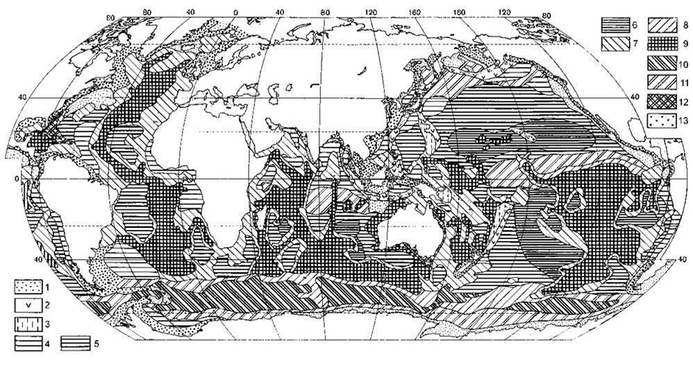 Рис. 5.42. Распространение главных типов современных осадков в Мировом океане. По Мурдмаа (1979).