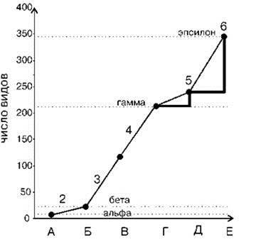 1 — рост числа видов по мере приближения пробной площадки к площади выявления ассоциации; 2 — увеличение числа видов на границе парцелл; 3 — увеличение числа видов на границе демутационных комплексов; 4 — увеличение числа видов на границе сукцессионных комплексов; 5 — увеличение числа видов на границе биогеографических регионов (ареалов сукцессионных систем); 6 — увеличение числа видов на границе провинций. Дальнейшее увеличение масштаба рассмотрения (над- провинции, подобласти, области) сопровождается скачкообразным увеличением числа видов (на рисунке не показано).