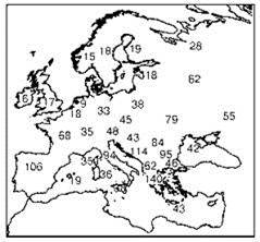 Широкое принятие “араратской” концепции объясняет многочисленные попытки выяснить место происхождения таксона надвидового ранга путём картирования числа видов (или других подчинённых таксонов). Для этого на карту наносят число таксонов*, отмеченных в каком-либо достаточно маленьком районе и проводят изолинии (Рис. 2.41). При этом выявляют места, где видов много, и места, где их мало. При интерпретации необходимо помнить, что такие карты обычно построены по сравнительно небольшому числу точек, поэтому более или менее достоверными на них являются положение пиков и общий тренд. Границу ареала изучаемого таксона, как обычно, проводят с изрядной долей экстраполяции. Что касается положения изолиний на таких картах, то их проводят с гораздо большими экстра- и интерполяциями на основе недоказанного предположения о плавном изменении числа видов в пространстве, т. е. эти линии — не факты, а их интерпретация. Гораздо более корректным было бы нанесение самих данных на карту, но это делают гораздо реже, возможно потому, что картинки получаются не столь красивые (Рис. 2.42).