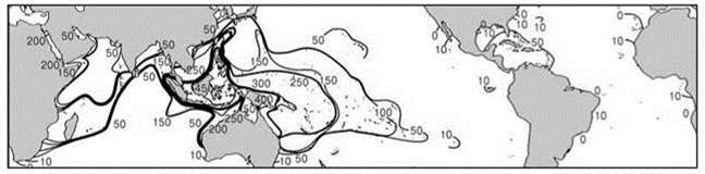 Относительно первого допущения имеются две диаметрально противоположные точки зрения. Согласно одной, виды, обитающие в центре происхождения, древнее таксонов, обитающих на периферии. Такого мнения придерживаются основатель кладистики энтомолог W. Hennig и другой энтомолог — W. Brnndin. Согласно другой точке зрения, которой, в частности, придерживается такой известный биогеограф (тоже энтомолог), как Дарлингтон (1966), новообразованные виды вытесняют пред- ковые на периферию ареала. Так же считает и J.C. Briggs (1974,1992, 1995, 2003, 2004). Эта точка зрения согласуется с данными по распределению возраста герматипных кораллов (Рис. 2.43), хотя герматипные кораллы и не являются естественным таксоном, а лишь жизненной формой, да к тому же это является не единственным возможным объяснением уменьшения возраста таксонов из центра разнообразия к периферическим районам. Второе допущение, вроде бы, не очень согласуется с представлением континуалистов о преимущественном происхождении видов путём географической изоляции, хотя, с точки зрения структуралистов, это вполне возможно.