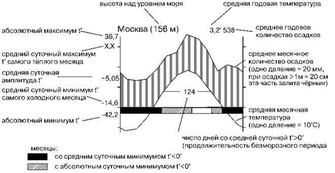 Из многочисленных климатических показателей для функционирования наземных сообществ наиболее важны годовые балансы и динамика хода температур и увлажнения. Для наглядности эти данные принято представлять в виде климадиаграмм — графиков, на которых показаны изменения этих параметров по месяцам. В настоящее время наибольшее распространение получила форма климадиаграмм, предложенная известным геоботаником Г. Вальтером в 1960 г. На них показаны ход средних месячных температур в °С и количества осадков в миллиметрах, при этом масштаб 1°=2 мм. Такое соотношение масштабов было подобрано эмпирически, поскольку оно достаточно точно отражает условия увлажнения. В период с достаточным увлажнением кривая температуры расположена ниже кривой осадков, соответствующую часть на диаграмме заполняют вертикальной штриховкой. В засушливый период кривая температуры расположена выше кривой осадков, эту площадь заполняют точечной штриховкой. Во влажных тропиках для осадков, превышающих 100 мм в месяц, масштаб уменьшают в 10 раз, а соответствующую область диаграммы закрашивают чёрным. Это позволяет избежать слишком громоздких диаграмм, уменьшение же точности диаграммы несущественно, поскольку такое количество осадков избыточно и осадки уходят в сток, а не включаются в обмен СС. На климадиаграмме показывают также продолжительность безморозных периодов и абсолютные минимумы и максимумы температур, высоту над уровнем моря и другие параметры. Расшифровка содержания климадиаграммы на конкретном примере дана на Рис. 3.8.
