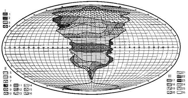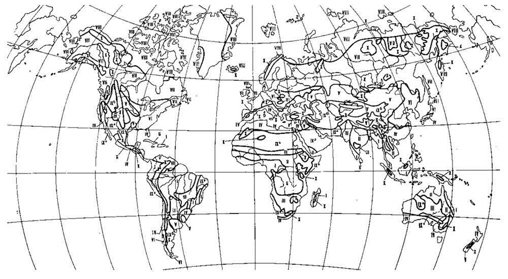 II. Внетропические зоны северного полушария: 5 — сухие пустыни; 6 — холодные внутриматериковые пустыни; 7 — субтропические зимне-зелёные степи; 8 — зона зимних дождей с жарким летом; 9 — зона травяных степей с холодной зимой; 10 — зона влажных муссонных и лавровых лесов с жарким летом; 11 — летнезелёные леса; 12 — океанические летнезелёные листопадные и лавровые леса; 13 — бореальные хвойные леса; 14 — бореальные берёзовые леса; 15 — субарктические тундры; 16 — арктические холодные пустыни.