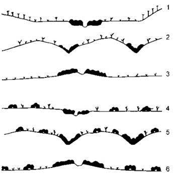 В действительности же это мозаика совершенно различных ассоциаций: чистых злаковников, саванн и больших или меньших лесных массивов. 1 — галерейный саванны; 2 — овражные саванны; 3 — саванны с лесами по береговым валам (“леса бакко”); 4 — галерейно-термитные саванны; 5 — овражно-термитные саванны; 6 — термитные саванны с лесами по береговым валам и “термитными островами”. В термитных саваннах деревья растут только на заброшенных термитниках, где они избегают отрицательных последствий пожаров или затопления.