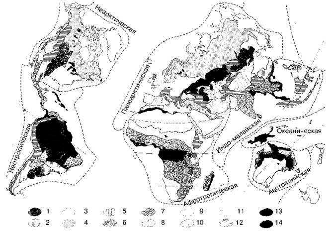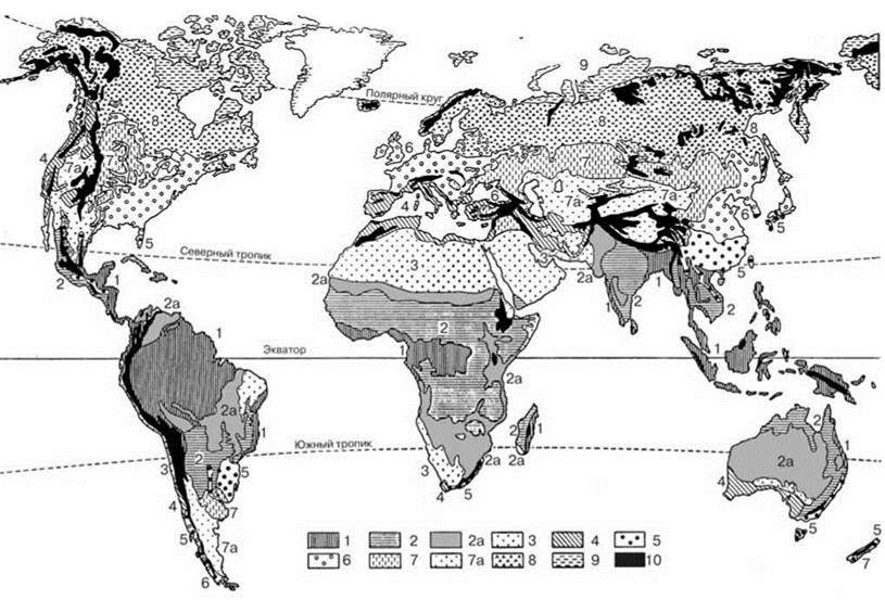 Тропические: 1 — влажные экваториальные и тропические леса, 2 — тропические леса, редколесья и колючие кустарники, 3 — саванны. Субтропические: 4 — субтропические леса и кустарники. Умеренные и субполярные: 5 — степи, прерии и их аналоги в южном полушарии, 6 — широколиственные леса, 7 — бореальные хвойные леса, 8 — тундры и их аналоги в южном полушарии, 9 — пустыни (а — тропические и субтропические, б — умеренного пояса), 10 — горные и высокогорные типы.