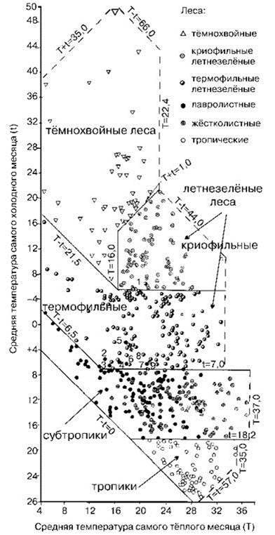 Проанализировав данные по связи распределения растительности с температурой и влажностью в 531 точках Земного шара, С.М. Разумовский обнаружил, что для объяснения распределения различных зон растительности достаточно двух параметров: средней температуры самого тёплого месяца и средней температуры самого холодного месяца (Рис. 3.15), увлажнение же оказалось несущественным фактором. Он объяснил это способностью СС эффективно регулировать влажность своих биотопов. Режим увлажнения оказывает влияния не на распределение СС, а лишь на распространённость в данном месте тех или иных сукцессионных стадий и серий. При обсуждении причин возникновения безлесных СС также было показано, что ни режим увлажнения, ни температурные условия сами по себе не являются причинами, обуславливающими возникновение безлесных СС. Поскольку лесные и безлесные ассоциации отличаются прежде всего ролью мегафауны, это подтверждает вывод С.М. Разумовского.