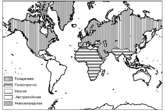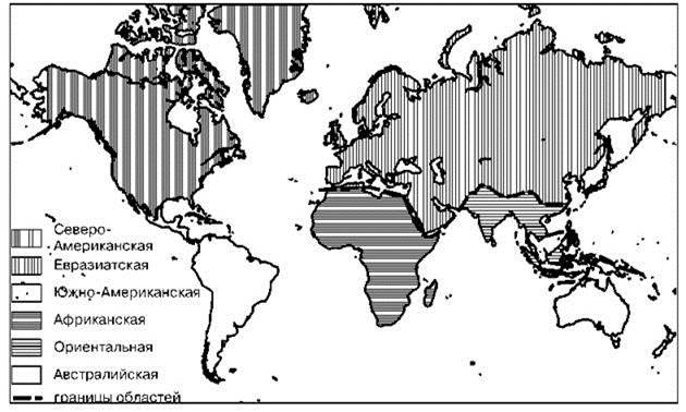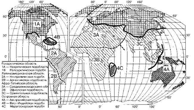 Области (подобласти): I — Голарктическая; II — Неотропическая (1 — Патагонско-Чилийская, 2 — Бразильская, 3 — Центральноамериканская, 4 — Антильская); III — Эфиопская (1 — Западноафриканская, 2 — Восточноафриканская, 3 — Южноафриканская), IV — Индо-Малайская (1 — Индийская, 2 — Бирманско-Китайская, 3 — Зондская, 4 — Филиппинская, 5 — Целебесская); V — Австралийская (1 — Австралийская, 2 — Папуасская); VI — Мадагаскарская; VII — Полинезийская (1 — Полинезийская, 2 — Гавайская); VIII — Новозеландская.