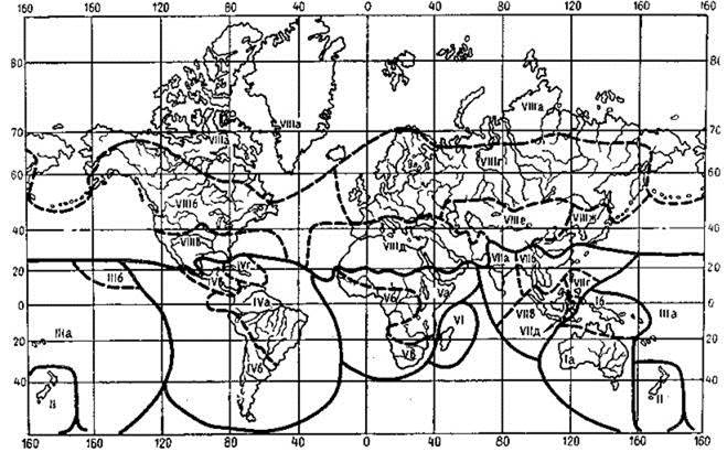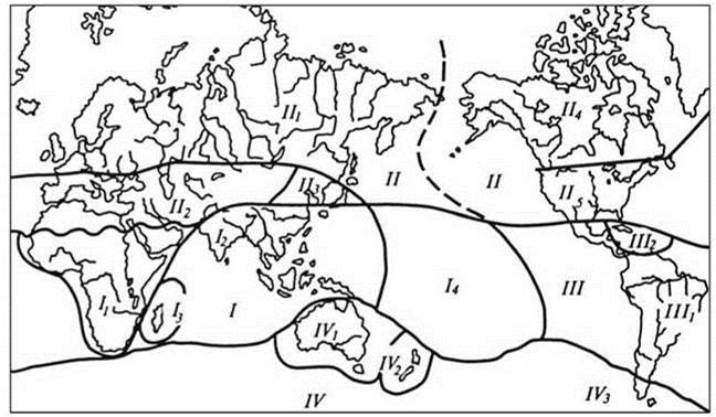 Области (подобласти): I — Голарктическая (1 — Бореальная, 2 — Мадреанская (Сонорская), 3 — Древнесредиземноморская (Тетисовая), 4 — Восточно-Азиатская); II — Палеотропическая (5 — Афро-Аравийская, 6 — Андо-Малезийская, 7 — Мадагаскарская, 8 — Древнеокеаническая); III — Неотропическая; IV — Южноафриканская; V — Австралийская; VI — Голантарктическая.