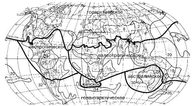 Названия областей надписаны, провинции: 1 — Циркумбореальная, 2 — Восточная азиатская, 3 — Североамериканская атлантическая, 4 — Скалистых гор, 5 — Макаронезийская, 6 — Средиземноморская, 7 — Сахаро-Аравийская, 8 — Ирано-Туранская, 9 — Мадреанская, 10 — Гвинео-Конголезская, 11 — Узумбаро-Зулулэндская, 12 — Судано-Замбезийская, 13 — Кару-Намиба, 14 — островов Св. Елены и Вознесения, 15 — Мадагаскарская, 16 — Индийская, 17 — Индокитайская, 18 — Малезийская, 19 — Фиджийская, 20 — Полинезийская, 21 — Гавайская, 22 — Новокаледонская, 23 — Карибская, 24 — Гвианского нагорья, 25 — Амазонская, 26 — Бразильская, 27 — Андийская, 28 — Капская, 29 — Северо-восточноавстралийская, 30 — Юго-западноавстралийская, 31 — Центральноавстралийская, 32 — Хуан-Фернандесская, 33 — Чилийско-Патагонская, 34 — Субантрактических островов, 35 — Новозелендская.