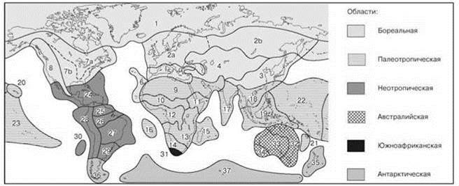 Провинции: 1 — Арктическая и субарктическая, 2 — Евро-Сибирская (а — Европейская, b — Азиатская), 3 — Сино-Японская, 4 — Западная и Центральноазиатская, 5 — Средиземноморская, 6 — Макаронезийская, 7 — Атлантическая североамериканская (а — Северная, b — Южная), 8 — Тихоокеанская североамериканская; 9 — Африкано-индийская пустынная, 10 — Суданская парковая степная, 11 — Северо-восточная африканская высокогорная, 12 — Западноафриканская дождевого леса, 13 — Восточноафриканская степная, 14 — Южноафриканская, 15 — Мадагаскарская, 16 — островов Вознесения и Св. Елены, 17 — Индийская, 18 — Континентальная юго-восточноазиатская, 19 — Малазийская, 20 — Гавайская, 21 — Новокаледонская, 22 — Меланизийско-микронезийская, 23 — Полинезийская; 24 — Карибская, 25 — Венесуэльско-гвианская, 26 — Амазонская, 27 — Южная бразильская, 28 — Андская, 29 — Пампасская, 30 — о. Хуан-Фернандес; 31 — Капская; 32 — Северная и Восточная Австралийская, 33 — Юго-западная австралийская, 34 — Центральноавстралийская; 35 — Новозеландская, 36 — Патагонская, 37 — Южных океанических островов.