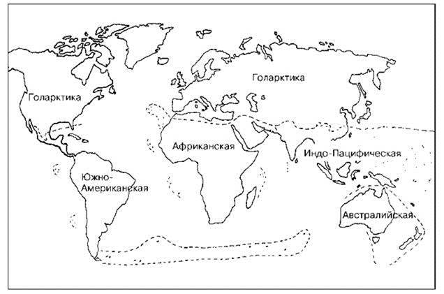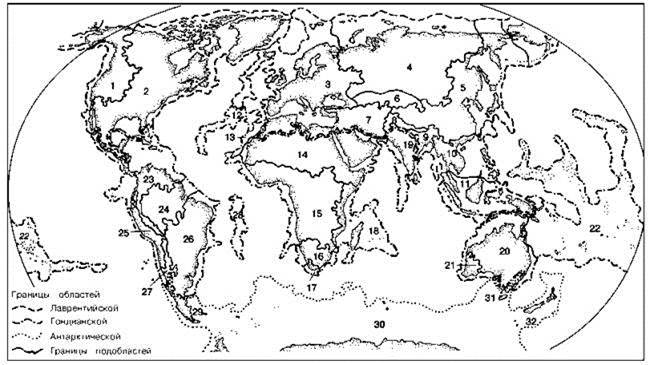 Гондванская (12 — Атлантическая, 13 — Марокканская, 14 — Абиссинская, 15 — Среднеафриканская, 16 — Каффрская, 17 — Капская, 18 — Мальгашская, 19 — Индостанская, 20 — Австралийская, 21 — Западно-австралийская, 22 — Тихоокеанская, 23 — Антильская, 24 — Амазонская, 25 — Перуанская, 26 — Бразильская, 27 — Тукуманская, 28 — Святой Елены).