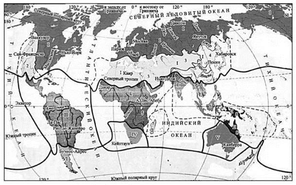 Ландшафты: 1 — тундра, 2 — тайга, 3 — леса широколиственные и субтропические, 4 — влаголюбивый тропический лес, 5 — степь, 6 — пустыня, 7 — саванна, 8 — горы.