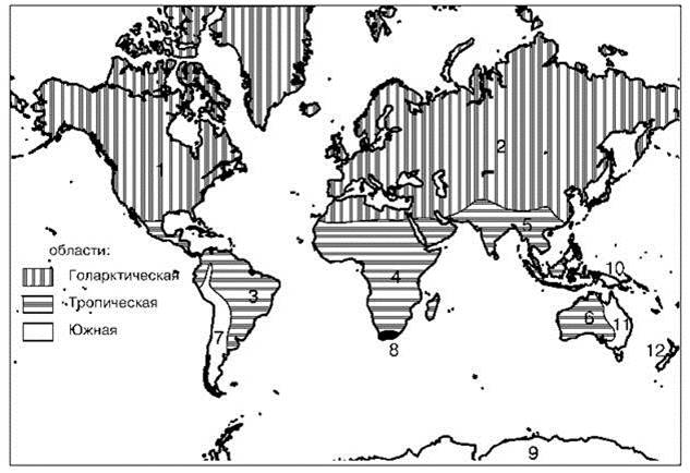 Области (подобласти): Голарктическая (= Лавразия) (1 — Неарктическая, 2 — Палеарктическая); Тропическая (= восточная Гондвана) (3 — Неотропическая, 4 — Афротропическая, 5 — Ориентальная, 6 — Австралотропическая); Южная (= западная Гондвана) (7 — Андская; 8 — Капская, или Афроумеренная, 9 — Антарктическая, 10 — Новогвинейская, 11 — Австралоумеренная, 12 — Новозеландская).