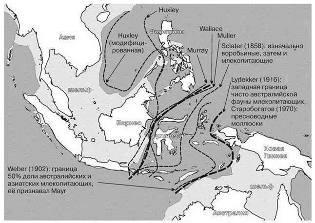 Большая часть границ, проводимых биогеографами в данном районе, расположены между линиями Уоллеса и Lydekker (на Рис. 3.40 эти линии более жирные). Линия Уоллеса совпадает с восточной границей азиатского шельфа. Линия Lydekker — с западной границей австралийского шельфа. Острова, расположенные между этими границами, никогда не соединялись с материками и были заселены биотами Азии и Австралии, преодолевавшими проливы. Так как источники биот архипелага (Австралия и Азия) расположены на его разных концах, в нём установилась клина, постепенный переход между биотами этих двух материков. Необходимо отметить, что до настоящего времени сведения о естественных биотах отдельных островов далеки от полноты. Так, изучение в 2012 (sic!) авиафауны Obi, одного из крупнейших островов этого района, показало, что из 109 видов авиафауны острова, 14 ранее на острове не отмечали, а 4 принадлежат к ещё неописанным видам (Mittermeier, Cottee-Jones, 2013). Наличие клины и плохая изученность региона позволяет проводить границу по-разному в зависимости от использованных критериев (своих у каждого автора) и изучаемой группы. Некоторые, отчаявшись, предлагают весь регион считать переходным (Cox, 2001).