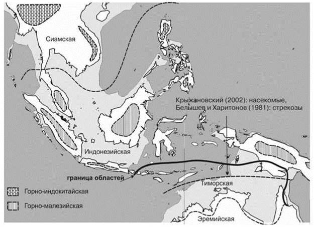 Общепринятое объяснение положения границы на месте Макассарского пролива между Борнео и Сулавеси, возникшего в эоцене, примерно позже 45 млн. лет назад (Lohman et al., 2011) и ныне имеющего ширину 200 км и глубиной до 2,5 км, восходящее к идеям А. Wallace, и которое считают несомненным авторы современных учебников биогеографии (см., например, Brown, Lomolino, 1998; Лебедева, Дроздов, Криволуцкий, 2004). Это объяснение удовлетворительно соответствует наблюдаемой картине только в случае некоторых таксонов наземных животных (млекопитающих и наземных моллюсков), некоторых птиц и пресноводную биоту (см. Главу 4).