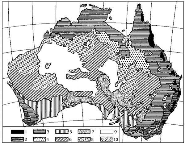 1 — тропически-субтропический дождевой лес с индо-малайскими флористическими элементами; 2 — влажный эвкалиптовый лес; 3 — сухой эвкалиптовый лес; 4 — злаковники, образованные Astrebla; 5 — разреженные заросли кустарниковых эвкалиптов (мали-скраб); 6 — заросли Acacia aneura и др. (мульга); 7 — солянковая полупустыня, образованная видами Atriplex и Kochia; 8 — сообщества злаков с колючими листьями (спинифекс Triodia); 9 — необитаемые области называемые “пустынями”; 10 — альпийские луга (только на юго-востоке, в Австралийских Альпах).