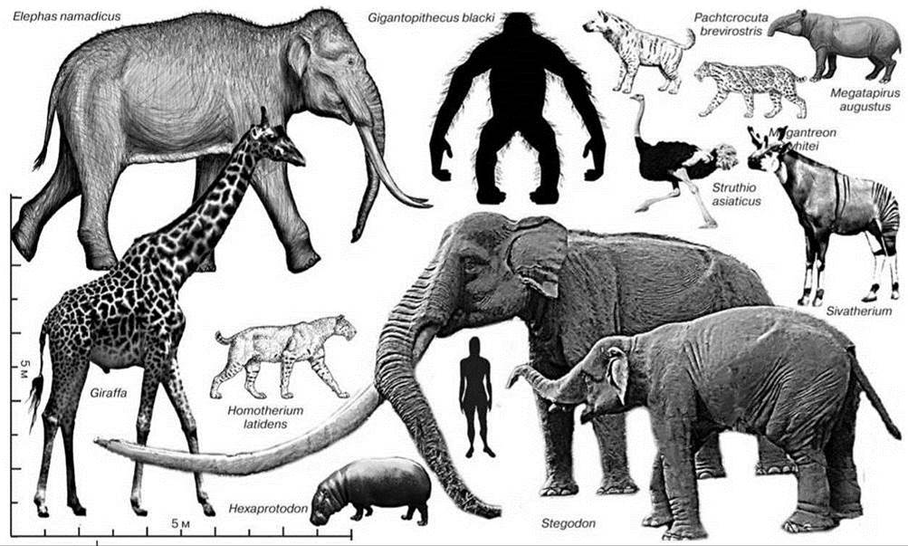 Рис. 3.56. Некоторые представители мегафауны, исчезнувшие с появлением человека в Ориентальной подобласти (в одном масштабе).
