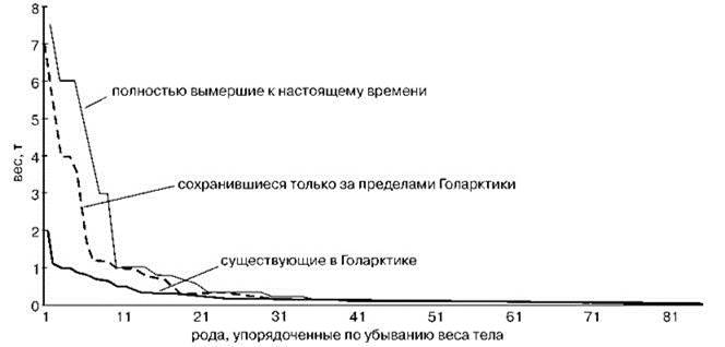 Рис. 3.58. Распределение по размеру родов крупных млекопитающих Голарктики, существовавших в течение последних 15000 лет по Жегалло и др. (2001).
