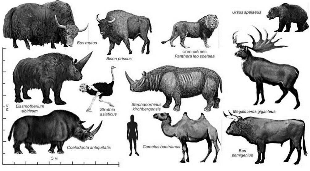 Рис. 3.59. Некоторые представители мегафауны, полностью или почти полностью исчезнувшие с появлением Homo spp. в Палеарктике (не показаны многочисленные виды, лишь заходившие в южные части Палеарктики из тропической Азии.
