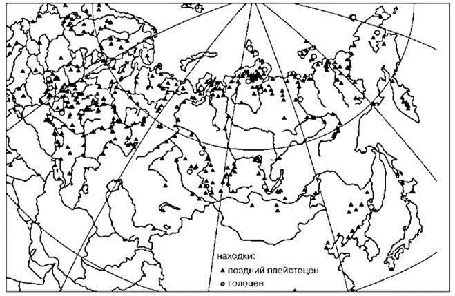 Находки: 1 — позднего плейстоцена; 2 — голоцена. По Калякину, Турубановой (2002).