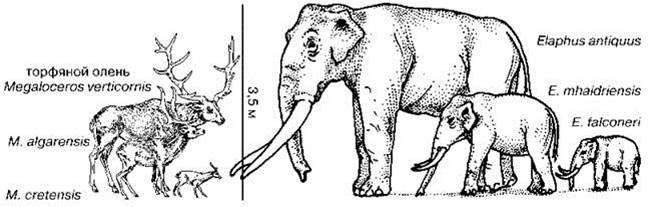 Рис. 3.61. Материковые и островные формы торфяного оленя и южного слона. По: Brown, Lomolino (1998).