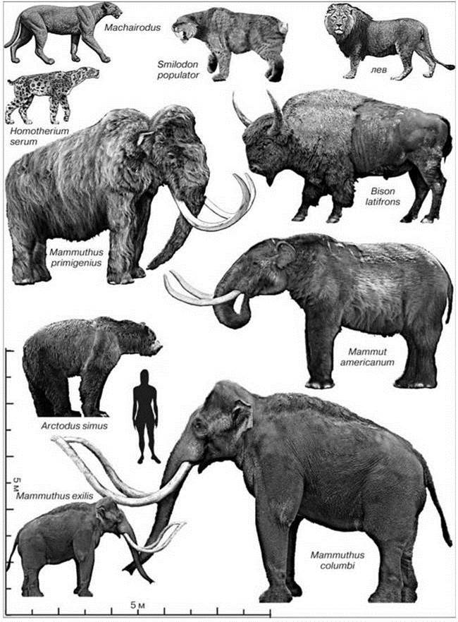 Саблезубые кошки. В плейстоцене на севере Евразии обитал Homotherium latidens (размером со льва или тигра, до 1,2 м в плечах, вес до 350 кг).