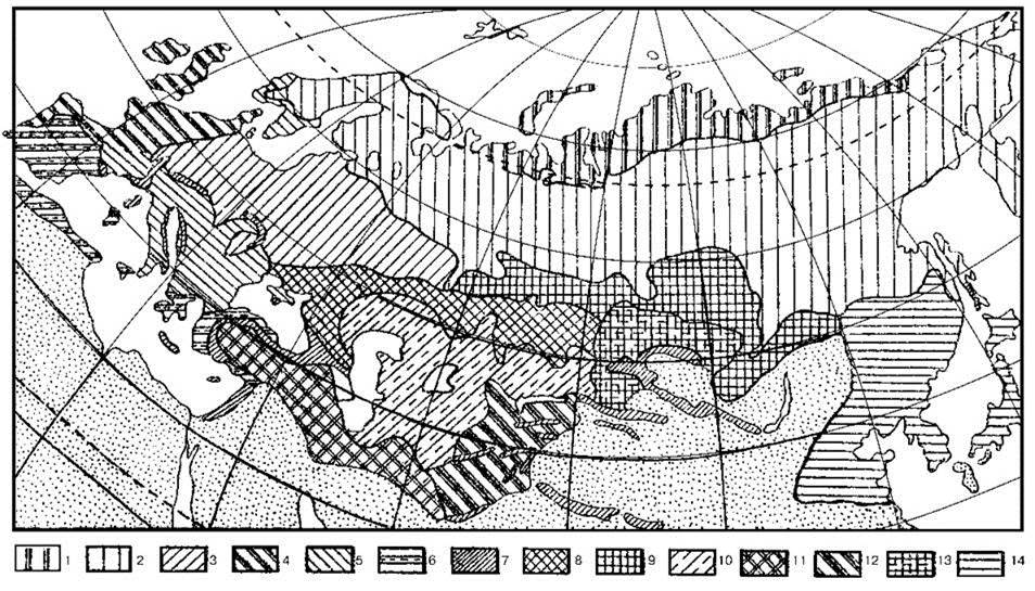 Рис. 3.65. Зональность северной Евразии по климаксным ассоциациям по С.М. Разумовскому (1999).