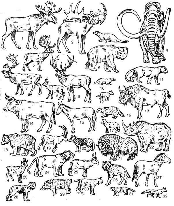 1 — лось Alces alces, 2 — гигантский олень Megaceros giganteus, 3 —выдра Lutra lutra, 4 — мамонт Mammuthus primigenius, 5 — лань Cervus dama, 6 — пещерный медведь Ursus spelaeus, 7 — северный олень Rangifer taran- dus, 8 — европейская косуля Capreolus capreolus, 9 — благородный олень Cervus elaphus, 10 — барсук Meles meles, 11 — леопард Panthera pardus, 12 — песец Alopes lagopus, 13 — бизон Bison priscus, 14 — тур Bos primigenius, 15 — европейский плейстоценовый осёл Asinus hidruntinus, 16 — росомаха Gula gulo, 17 — волк Canis sp., 18 — бурый медведь Ursus arctos, 19 — горный козёл Capra ibex, 20 — красный волк Cuon alpinus europaeus, 21 — овцебык Ovibos moschatus, 22 — шерстистый носорог Colodonta antiquitatus, 23 — серна Rupicapra rupicapra, 24 — пещерный лев Panthera spelaea, 25 — сайга Saiga tatarica, 26 — пещерная гиена Crocuta spelaea, 27 — лошадь Пржевальского Equus przewalskii, 28 — волк Canis lupus, 29 — кабан Sus scrofa, 30 — рысь Lynx lynx, 31 — лесной кот Felis silvestris, 32 — лиса Vulpes vulpes.