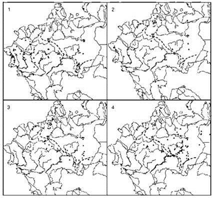 Находки: 1 — поздний плейстоцен — древний голоцен; 2 — ранний голоцен; 3 — средний голоцен; 4 — поздний голоцен по Калякину, Турубановой (2002). Границы ареала по Гептнеру и др. (1961): пунктир — восстановленная в историческое время, точки — середина 1950-х гг.