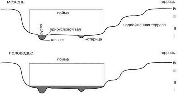 В поперечном сечении выделяют следующие основные морфологические структуры реки (Рис. 4.1). Русло — часть реки, по которой вода течёт постоянно или, в случае пересыхающих рек, наиболее долгий период. Линию, соединяющую наиболее низкие точки реки вдоль её русла, называют тальвег. Период, в который вода течёт по руслу, называют меженный период, или межень. Во время половодья или паводков русло не вмещает всю текущую по реке воду, и река разливается, заливая пойму. Пойму с боков ограничивают более или менее крутые склоны — коренные берега, появляющиеся в результате эрозионной деятельности реки при её разливах. Подземный сток также идёт в сторону реки, в результате у коренных берегов появляются участки с более высоким увлажнением, часто превращающиеся в болота. Вода течёт по реке из-за того, что она имеет потенциальную энергию, равную разнице высот в данной точке и в конце реки. Высоту, на которой потенциальная энергия воды реки равна нулю, называют базис эрозии. Базис эрозии данной реки — это уровень воды в водоёме, в который она впадает. Общим базисом эрозии для почти всех рек является уровень моря. Реки, принадлежащие к водосборным бассейнам, не имеющим стока в Мировой океан, могут иметь иной базис эрозии. Например, базисом эрозии для Волги является уровень поверхности Каспия, расположенный в настоящее время примерно (уровень варьирует от года к году) на 28 м ниже уровня океана. Если река протекает через озеро (водохранилище), то уровнем эрозии для её участка выше озера будет уровень воды в нём. При изменении базиса эрозии (даже уровень Мирового океана не является постоянным, см. Главу 5) эрозионная деятельность реки меняется. Если базис эрозии повышается, то эрозионная деятельность реки уменьшается (река подпруживается), уровень грунтовых вод в пойме и водосборном бассейне повышается, и начинается их заболачивание. При уменьшении высоты базиса эрозии, возрастает скорость эрозии, и река начинает углублять своё русло и пойму, уровень грунтовых вод падает. Следами более высокого положения базиса эрозии являются террасы — следы былых пойм реки. Совокупность поймы реки и её надпойменных террас образует долину реки.