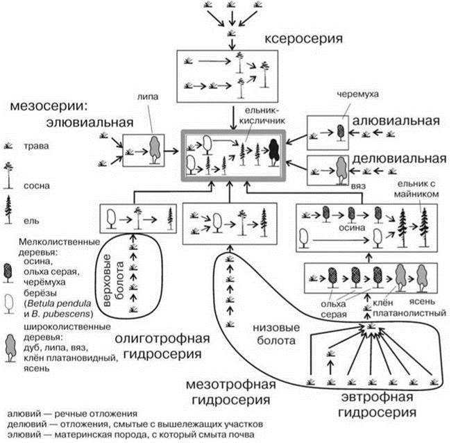 В гидрологической литературе описывают эндогенный переход низовых болот в верховые. Описание этого перехода (см. например, Михайлов, Добровольский, Добролюбов, 2008) также является продуктом чистого разума, поскольку совершенно не соответствует фактам. В действительности болота разных типов являются ранними стадиями разных сукцессионных рядов, т. е. сукцессионно между собой никак не связаны (Рис. 4.8). Верховые болота являются стадией олиготрофной гидросерии, а низовые — мезотрофной и эвтрофной, причём в Московском ботанико-географическом районе восьми (!) различных инициальных стадий, т.е. низовые болота с биологической точки зрения даже не являются естественной категорией. Любой, кто бывал на верховых болотах, знает, что для них весьма характерно наличие сфагновой плавнины над заросшим водоёмом, на ранних стадиях с окнами. Каких-либо следов стадии низового болота при этом обнаружить не удаётся. Болота Западной Европы и Северной Америки имеют возраст не более 15 000 лет, все они возникли в результате заболачивания озёр, образовавшихся при отступании ледника. В то же время из-за исходной мозаичности подстилающей поверхности вполне возможно существование комплексных болот, имеющих участки, принадлежащие разным экогенетическим сукцессионным сериям. Каждый из таких участков имеет собственное сукцессионное развитие и никогда не переходит один в другой. Переход болота одного типа в другой или заболачивание леса возможно только в результате экзогенного воздействия, обычно это воздействие имеет антропогенный характер. Например, поднятие уровня грунтовых вод, вызванное подпруживанием дренирующего местность водотока, верховое болото или лес превратит в низовое. Более сильное подпруживание приведёт к превращению низового болота в водохранилище. Говорить в этих случаях о развитии нет никаких оснований. При ненарушенном ходе сукцессий болото — конечная стадия зарастания водоёма (озера, реки), последующие стадии сукцессии принадлежат уже наземным ЦС.