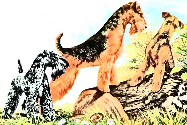 Но в остальном у терьеров была все же некоторая специализация — лейкленды охотились на лис самостоятельно, а задачей пятнистых фокстерьеров и черно-рыжих вельш терьеров было или выгнать лису и барсука из норы, или наоборот, задержать под землей на одном месте и лаем дать знать охотникам, где нужно раскапывать нору. А терьеров из долины реки Эйр, эрдельтерьеров, вывели для охоты на выдр и водяных крыс. Поэтому они значительно крупнее, но очень похожи на увеличенную копию вельш терьера. Эрдели со временем оказались отличными военными и служебными собаками.