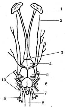 Рис. 3.152. Головной мозг окуня: 1— носовая капсула; 2 — глазничная ветвь тройничного нерва; 3 — обонятельные доли; 4 — передний мозг; 5 — средний мозг; 6 — задний мозг; 7 — продолговатый мозг; 8 — спинной мозг; 9 — блуждающий нерв; 10 — слуховой нерв