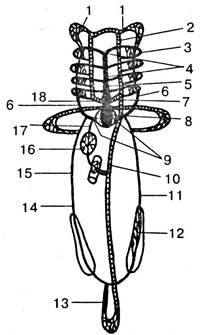 Рис. 3.159. Схема кровеносной системы костистой рыбы; 1— сонные артерии; 2 — корни аорты;3 — выносящие жаберные артерии; 4 — приносящие жаберные артерии; 5 — брюшная аорта; 6 — передние кардиальные вены; 7 — луковица аорты; 8 — желудочек; 9 — кювьеров проток; 10 — спинная аорта; 11 — левая задняя кардиальная вена; 12 — воротная система ночек; 13 — хвостовая вена; 14 — правая задняя кардиальная вена; 15 — подкишечная вена; 16 — воротная система печени; 17 — печеночная вена; 18 — предсердие
