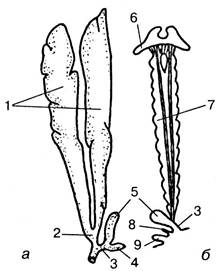 Рис. 3.162. Мужские половые органы (а) и почки (б) окуня: 1 — семенники; 2 — семенной проток; 3 — мочевой канал; 4 — мочеточник; 5 — мочевой пузырь; 6 — головная почка; 7 — туловищная почка; 8 — проток яичника; 9 — анус
