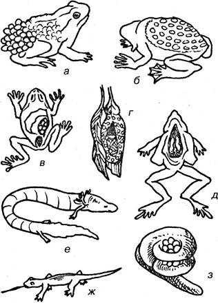 Рис. 3.165. Земноводные: а — самец жабы повитухи; б — самка суринамской квакши с выводковыми яйцами на спине; в — самка суринамской квакши с икрой в выводной сумке; г — гнездо яванской веслоногой лягушки; д — самец лягушки ринодерма с метафизирующими головастиками в горловом мешке; е — европейский протей; ж — пещерная саламандра; з — самка цейлонской червяги, обвившая комок икринок