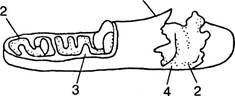 Рис. 1.6. Строение митохондрии: 1 — внешняя мембрана; 2 — внутренняя мембрана; 3— впячивания внутренней мембраны (кристы); 4— места впячивания (вид с поверхности внутренней мембраны)